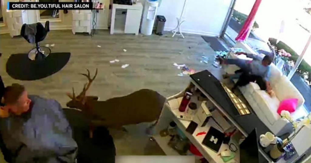 Wild video shows deer crashing through salon window