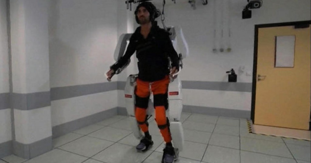 Paralyzed man walks using exoskeleton